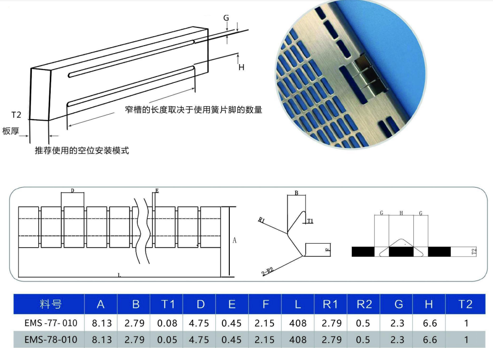 EMS-77-010是槽安裝鈹銅簧片,每一節都是一樣的,適合于各種槽安裝的場合,這種產品可用于接地和EMI屏蔽,EMS-77-010金屬簧片具有以下特點: